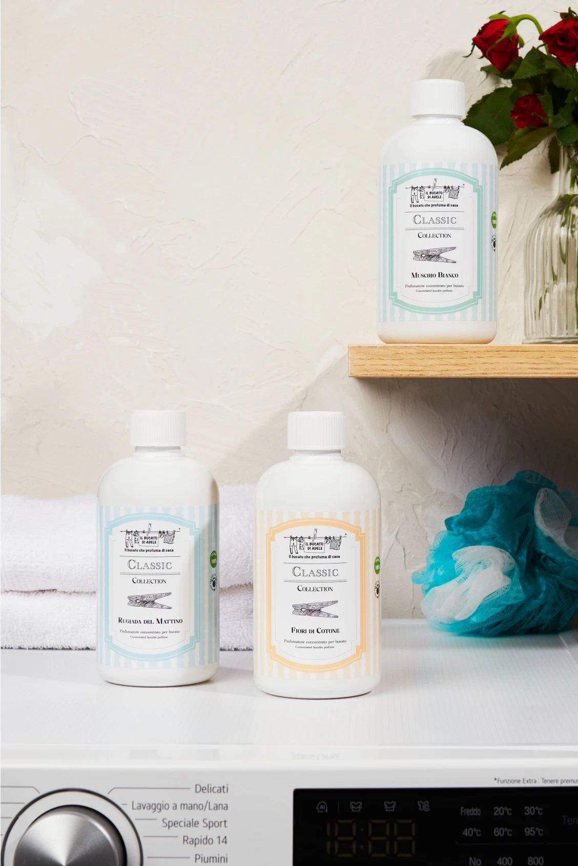 3 tijdloze geuren, met een klassieke twist zoals de was van weleer: Witte Musk, Katoenbloem en Ochtenddauw.